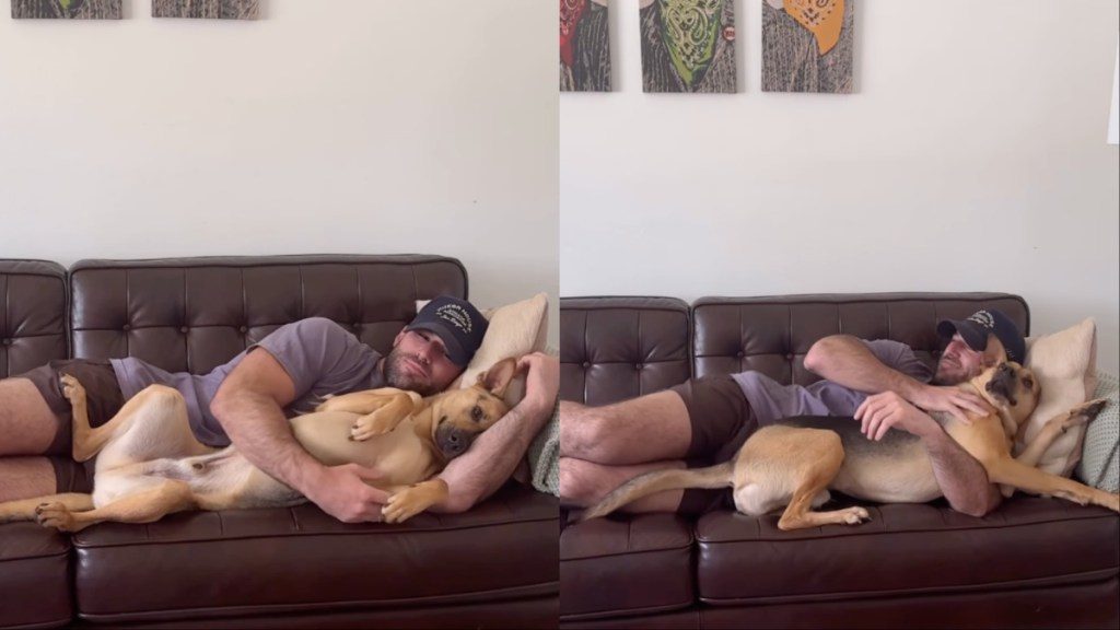 When the dad lies down on a couch, the fur baby instantly jumps on the couch. He wags his tail, takes a big yawn, paws the dad, and lies next to him, cuddling with his dad in the most adorable way. Henry was touched by the pup’s act as he mentioned the caption, “I was gone for a few days, and Cactus wasted no time climbing onto the couch for cuddles when I got home.”