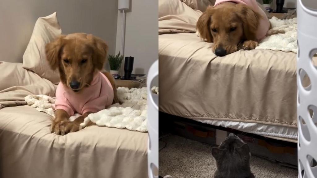 Put a Golden Retriever and a cat together, and there will never not be hilarious energy in the room — at least that is what this Instagram video from @kaikothegolden_kehlani proves. In the clip, a Golden Retriever named Kaiko and a rescue cat named Kehlani have turned bedtime into a nightly showdown. Naturally, the internet cannot stop watching.