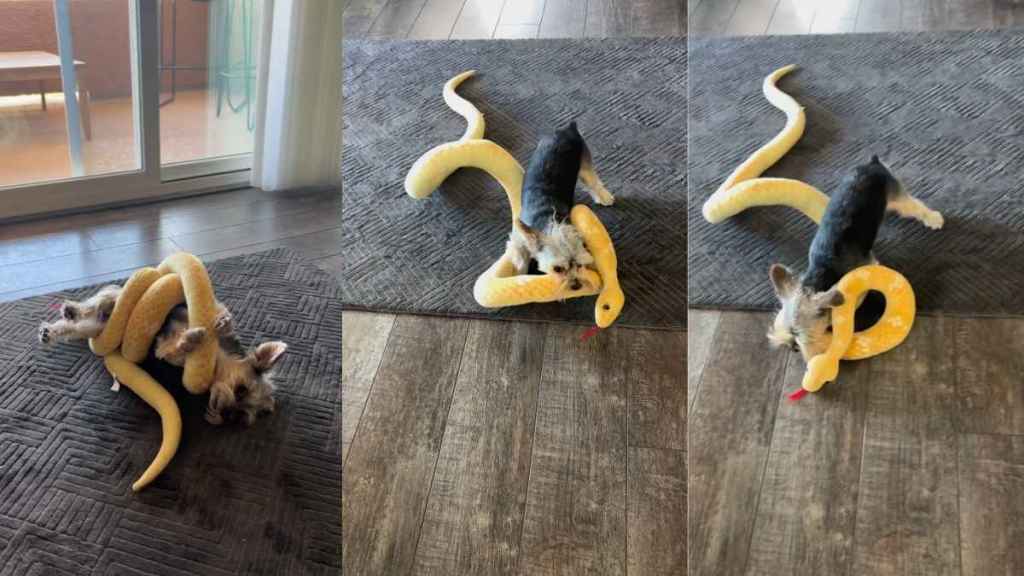 This video proves that a Yorkie may look cute and harmless, but when it comes to facing a “dangerous” foe, they show no hesitation in unleashing their “killer instincts.” Here, the enemy is a toy snake, which is completely harmless. Yet, the dog, named Sir Lancelot, makes it clear he means business. With a low growl and a fierce snap of his jaws, he lunges at the toy, determined to destroy it.