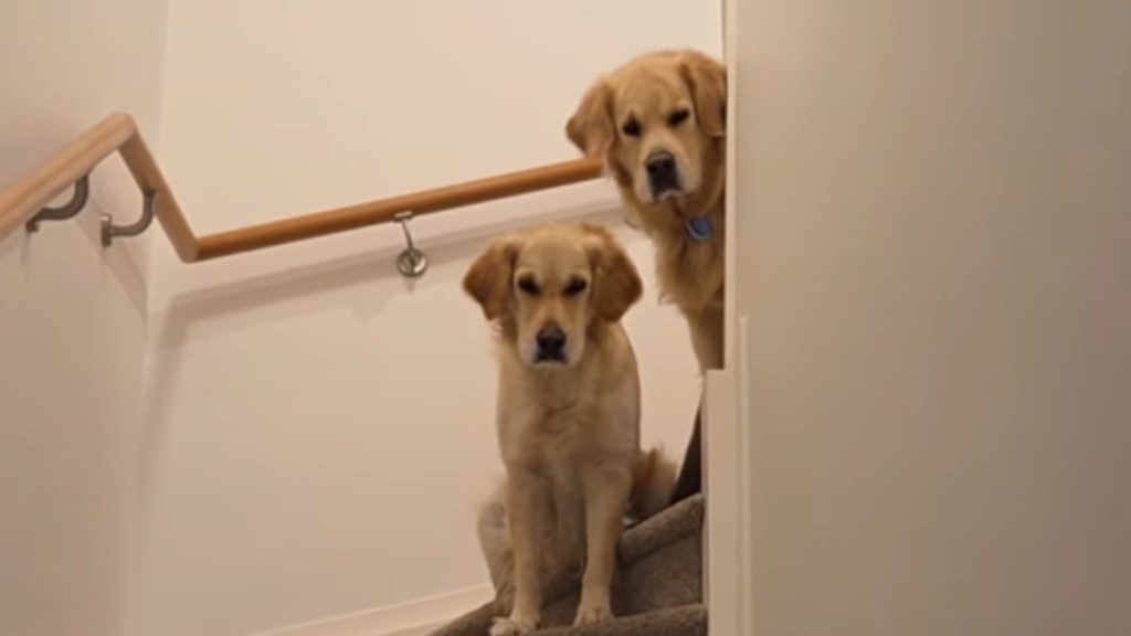 A video from @goldenduonz on Instagram shows two Golden Retrievers, Kronk and Yzma, sitting on a staircase and staring down at their mom and her friends like disappointed hall monitors. The setup comes through in the on-screen caption that explains how mom always tells them, “please be quiet, don’t bark.” But “when her friends come over,” everything changes.